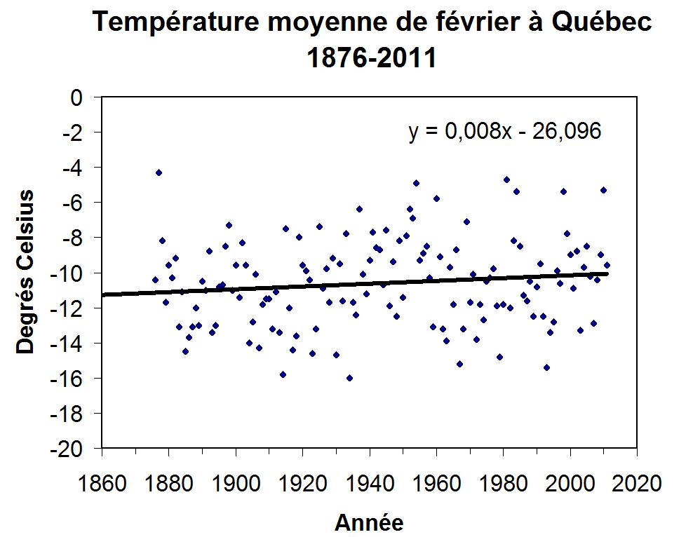 Vous pourrez vous faire une petite idée là-dessus quand j’aurai eu le temps (demain, jeudi ?) de publier les résultats de mes petites recherches que j’ai faites ce soir ! Elles portent sur la température moyenne de février à Québec, depuis 1876 jusqu’à nos jours.